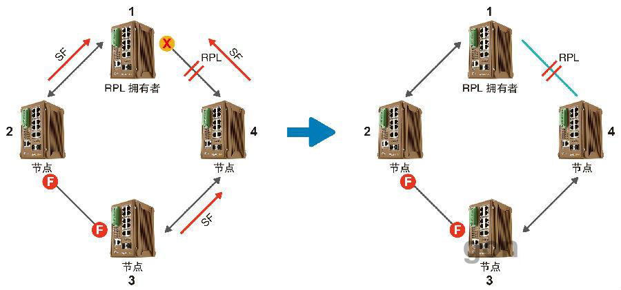 2.ERPS通過阻塞RPL鏈路,確保不會(huì)形成環(huán)路。在上圖中,節(jié)點(diǎn)1和節(jié)點(diǎn)4之間的鏈路為RPL鏈路。