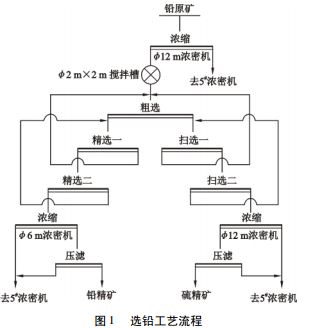 礦山選鉛工藝流程始建于1991年,提鉛原料主要為金氰化尾渣(鉛原礦),原設(shè)計(jì)處理鉛原礦能力80t/d。2003年為處理新建氰化廠氰渣,配套新建一套選鉛流程,設(shè)計(jì)處理能力80t/d。兩套浮選系統(tǒng)采用相同工藝,氰渣調(diào)漿后泵入選鉛濃縮機(jī)進(jìn)行濃縮,再進(jìn)入一次粗選、二次精選、二次掃選鉛浮選流程選出鉛精礦,經(jīng)濃縮機(jī)濃縮后壓濾成最終鉛精礦;浮選尾礦(硫精礦)進(jìn)入1濃縮機(jī)進(jìn)行濃縮,經(jīng)1臺(tái)XZA-240壓濾機(jī)壓濾后汽車運(yùn)至硫精礦堆場(chǎng)。